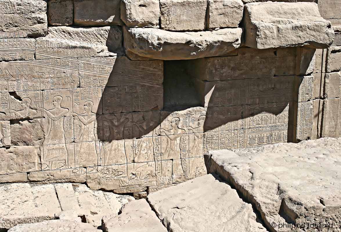 La procession du naos d'Horus est conduite par le roi Ptolémée VI Philometor. Il est suivi de prêtres portant des enseignes : à l'avant, Oupouaout du Sud, l'ouvreur des chemins; puis Horus de Behedet ; une autre forme d'Horus; le bélier d'Amon; Chou, fils de Rê...