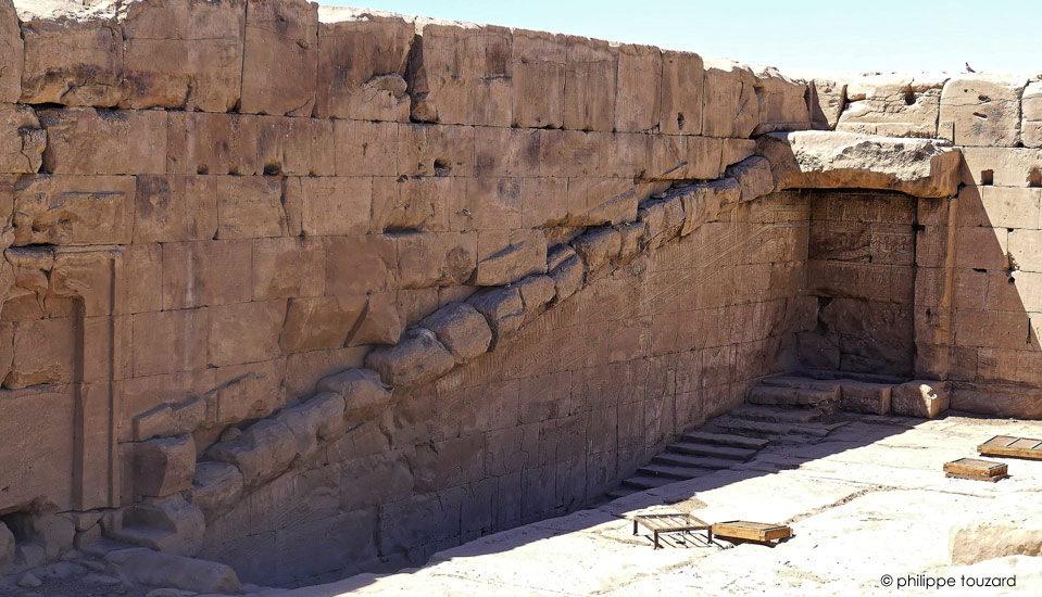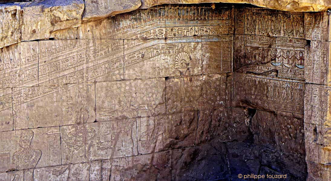 Des prêtres portent des petites chapelles suivis par un porteur d'éventail. Sur la paroi Nord, ont été inscrits les cartouches du roi et des signes prophylactiques. Les textes sont de Ptolémée VI et Ptolémée VIII.