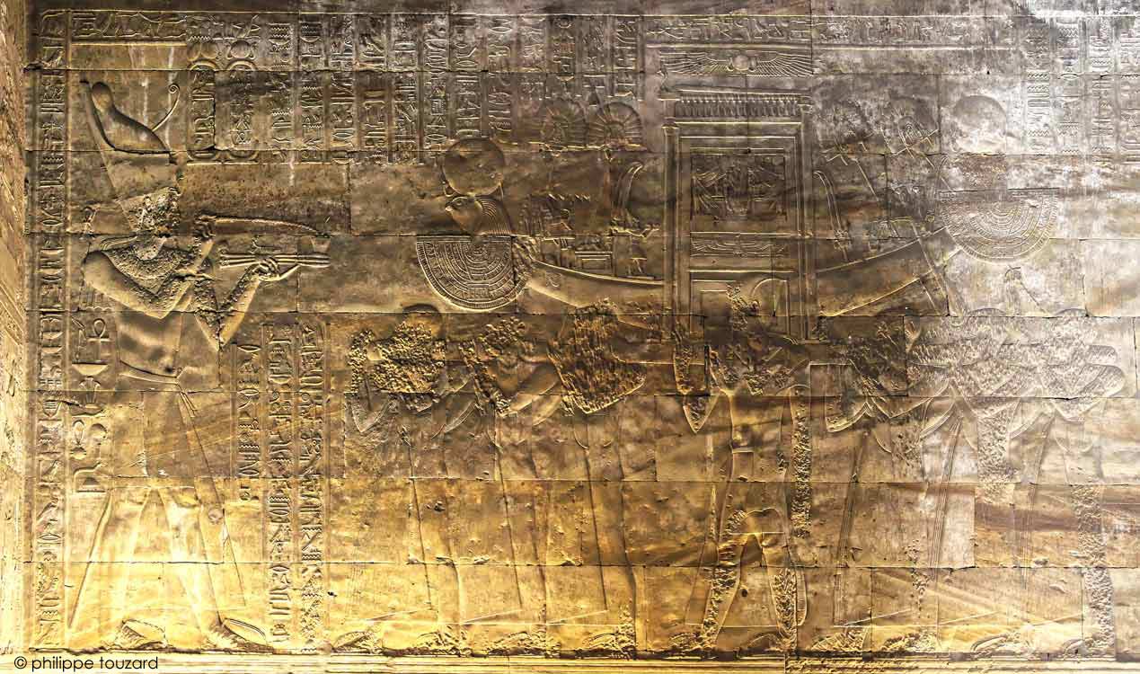 Le roi Ptolémée IV Philopator fait un encensement devant la barque d'Horus avec le grand encensoir dit 'Bras d'Horus'. Cinq prêtres de front sur 4 rangées portent la barque.Le roi est également représenté au milieu des porteurs. A l'avant de la barque, Oupouaout, l'ouvreur des chemins se dresse sur un pavois. Derrière lui, un petit sphinx et un petit roi font des offrandes devant la naos.