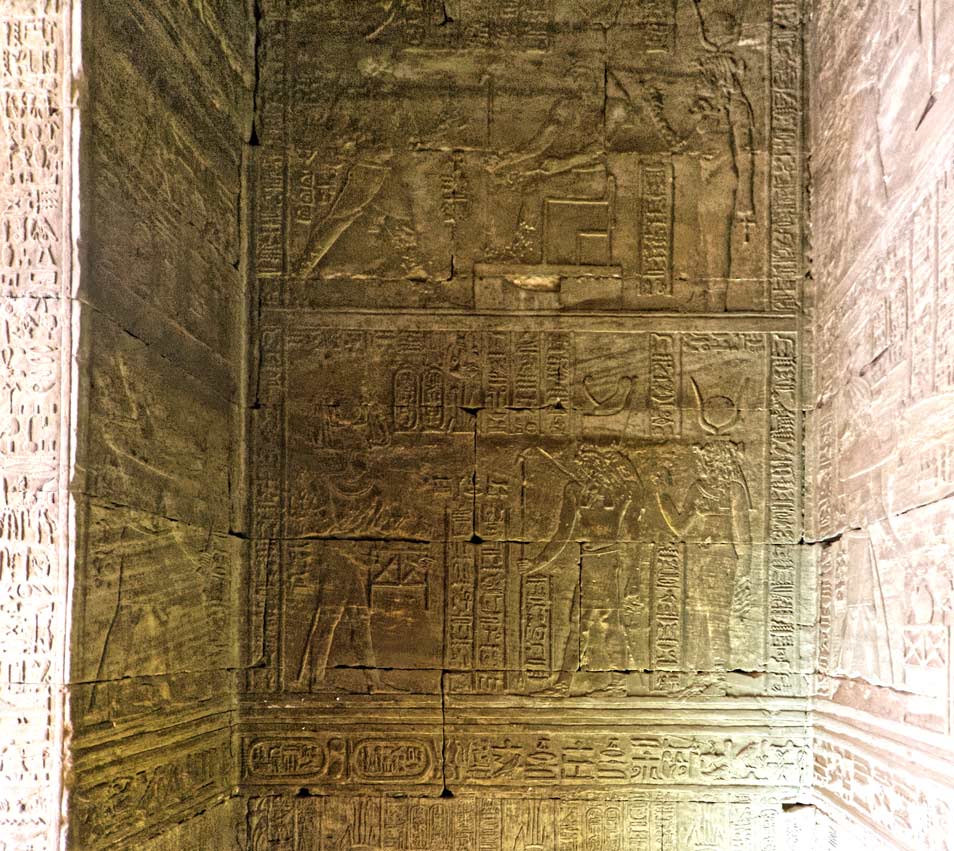 A gauche, on devine le montant de la porte donnant vers l'extérieur sur lequel le roi tient un sceptre, indiquant le sens d'orientation des scènes. En face deux des scènes de la paroi Nord :sur celle du haut, le roi Ptolémée VII apporte 2 vases avec de l'eau en courant vers Horus et Hathor. Celle du registre du bas est montrée sur la page suivante.