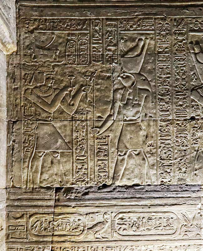Le roi Ptolémée VI offre 2 bracelets en or posés sur un plateau à Horus, le grand dieu