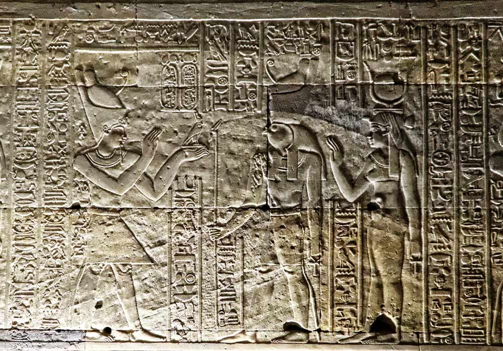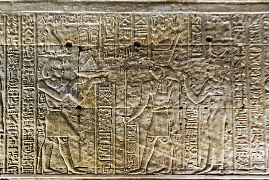 Le roi Ptolémée VI offre un sceptre Flagellum à Horus et Hathor, maîtresse de Iounet, oeil de Rê.