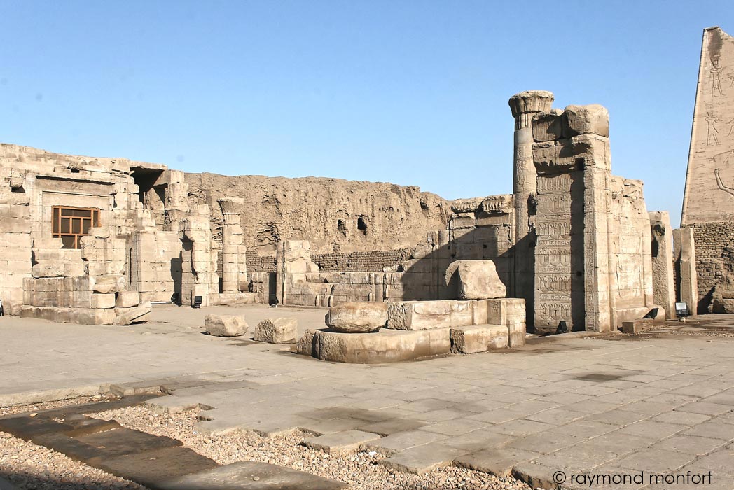 Le mammisi se trouve à l'extérieur du temple dont le pylône s'aperçoit à droite. Il est construit selon un plan simple :il est constitué d'un sanctuaire précédé d'une salle des offrandes. Le tout est entouré par une galerie à colonnes. Le temple principal est précédé par un vestibule et une cour très dégradée. La porte du sanctuaire se voit au fond à gauche. La barre de navigation ci-dessous permet de parcourir les différentes parties du mammisi.