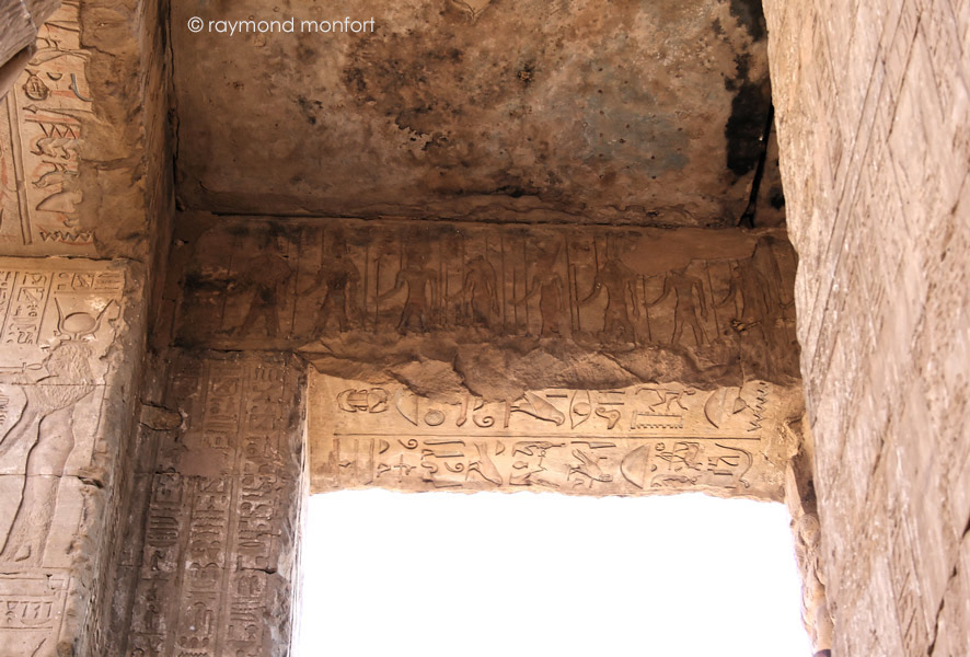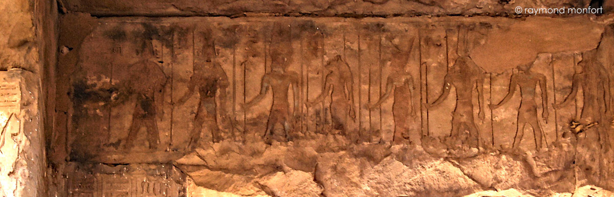 De gauche à droite, Thot avec la plume de Maât, Khnoum, Amon-Rê, ?, Ouadjet, Horus de Iabet (XIVème nome du Nord).