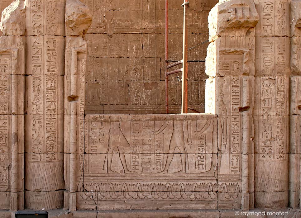Le roi offre un collier large héliopolitain à Horus de behedet accompagné d'Hathor.