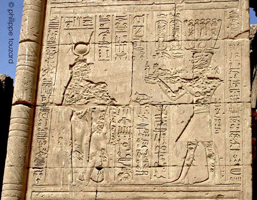 Le dieu Amon-Rê et la déesse Nekhbet. En haut, les inscriptions de l'architrave.