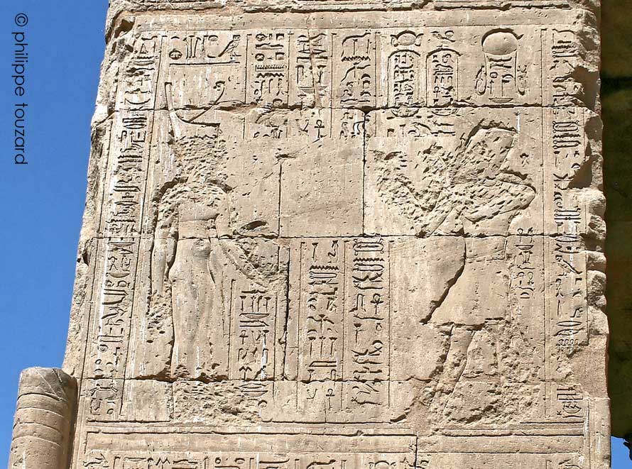Le roi Ptolémée IX Soter transperce le serpent Apophis devant Horus de Behedet, le grand dieu.