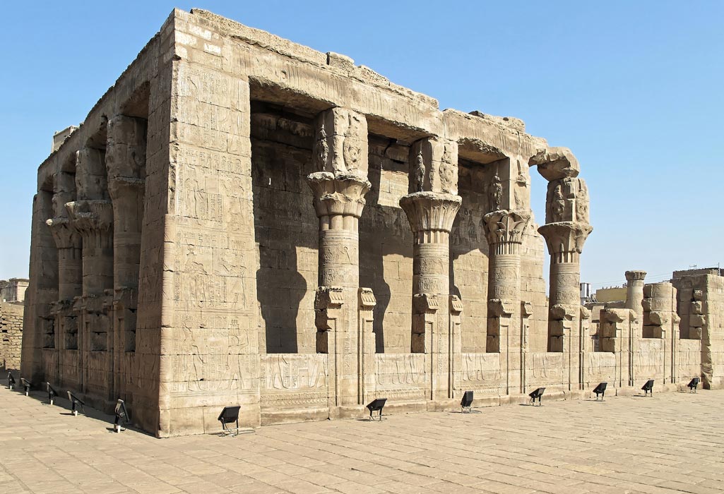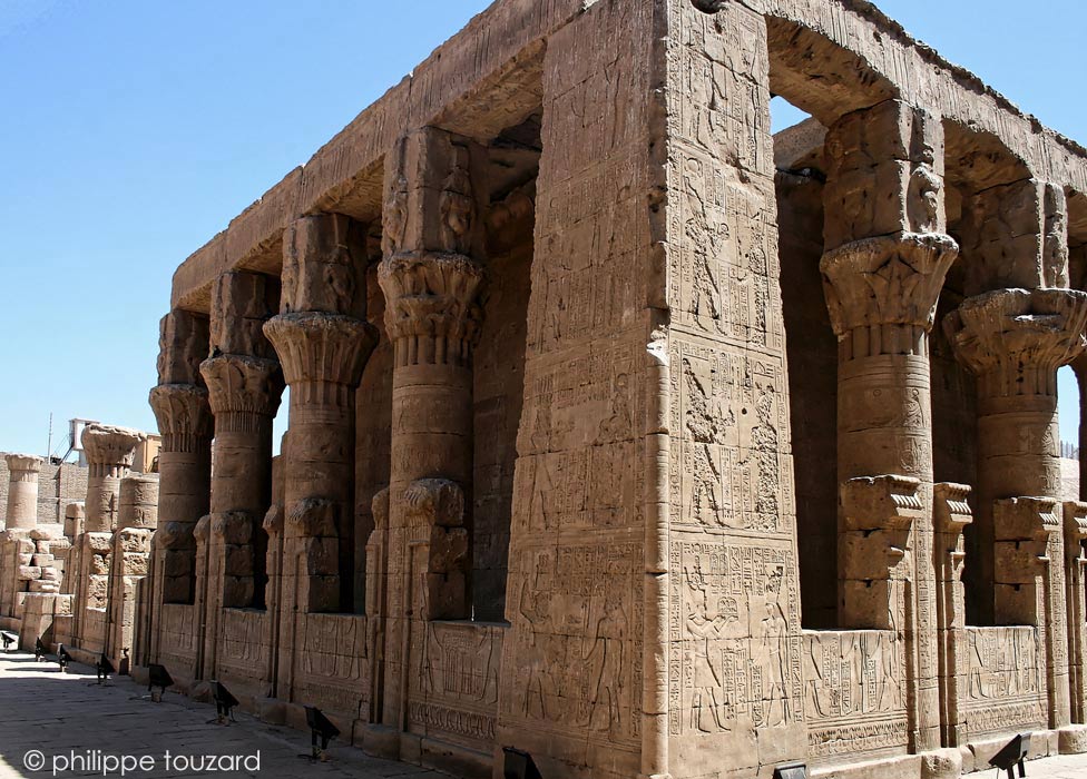 Aux deux coins du portique subsistent des piliers d'angle assez bien conservés. la partie Nord du portique inclut une porte permettant d'accéder au couloir qui entoure le monétaire. Les parois extérieures du sanctuaire sont couvertes de scènes d'offrandes.