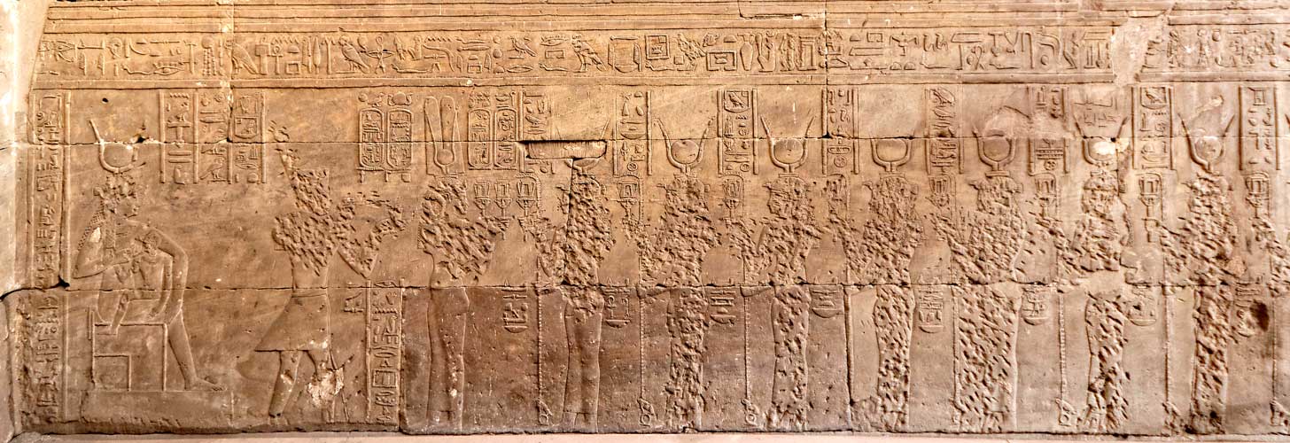 Toutes apportent un présent ou un bienfait à l'enfant-dieu. Devant les déesses Hathor, le roi Ptolémée VIII et la reine.