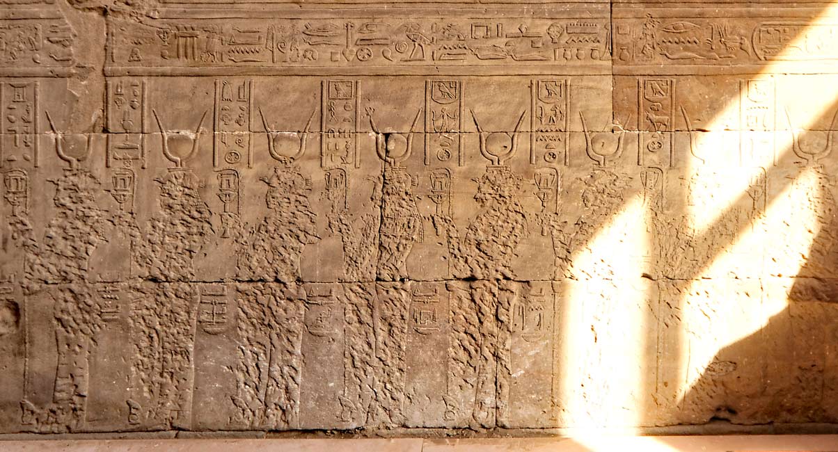 Sur le soubassement de la paroi Nord, est représenté un défilé de 20 déesses figurées comme des Hathor et contenant d'ailleurs 7 Hathor.