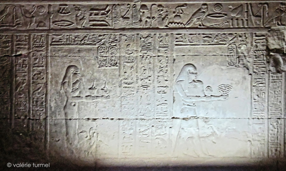 L'arrivée des offrandes se situe sur le soubassement de la paroi Nord. La procession est conduite par le roi de Basse Égypte (non visible sur cette vue) suivi par un dieu Nil du Nord. Viennent ensuite une femme porteuse de céréales du Nord accompagnée de bovins. Puis un homme portent différents pains, de toutes formes.