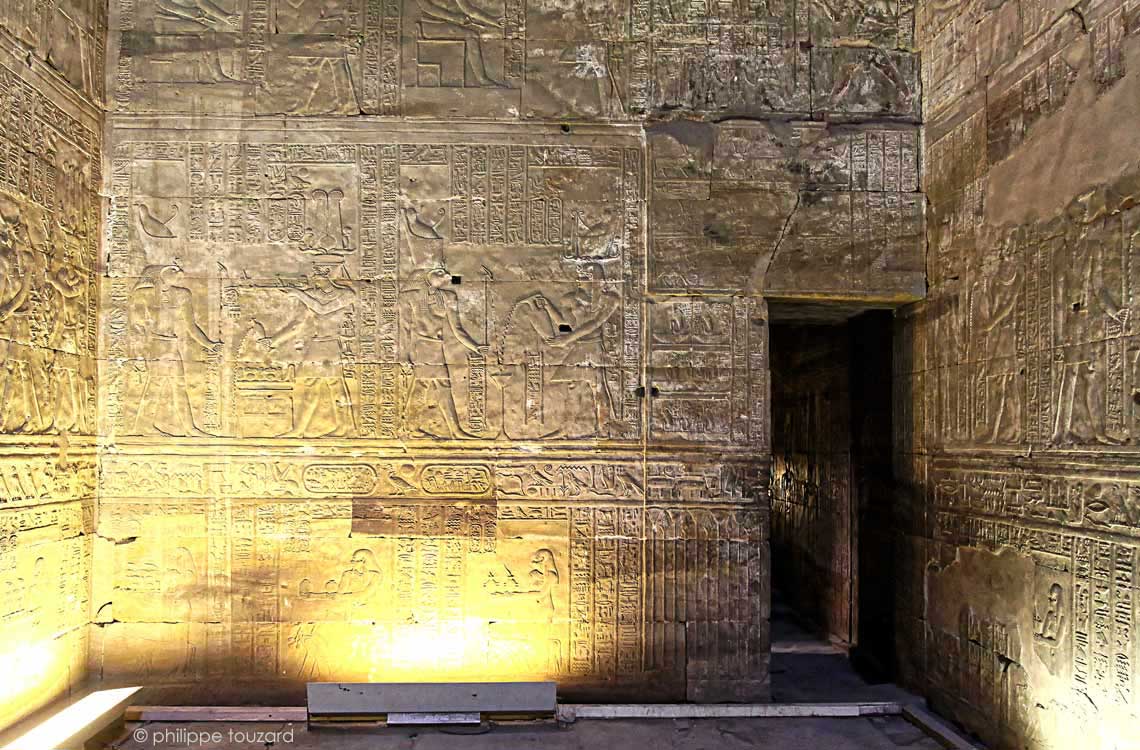 L'entrée de l'escalier est se fait par la porte de ce côté Est de la salle. Le linteau est orné de 12 déesses vaches sur 3 registres. Le montant gauche est orné d'uraei. (Vous pouvez emprunter l'escalier en cliquant sur la porte)
