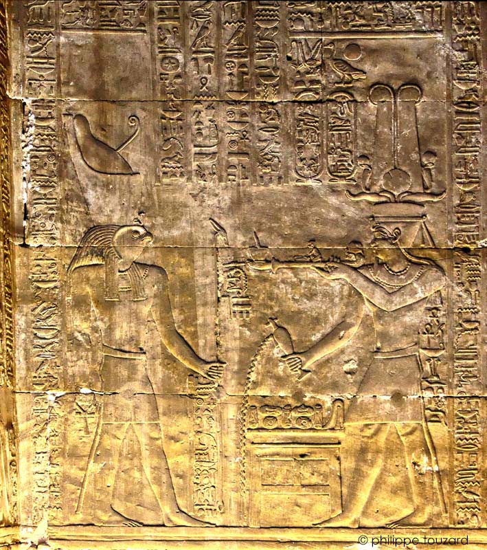 le roi Ptolémée IV Philopator verse une libation à Horus de Behedet.