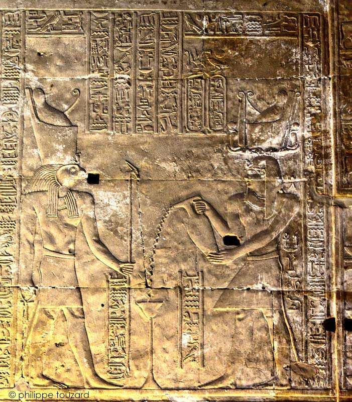 Le roi Ptolémée IV fait une double purification devant Horus. L'eau purifie et désaltéré le dieu. L'encens chasse les démons et fait venir l'âme de la divinité.