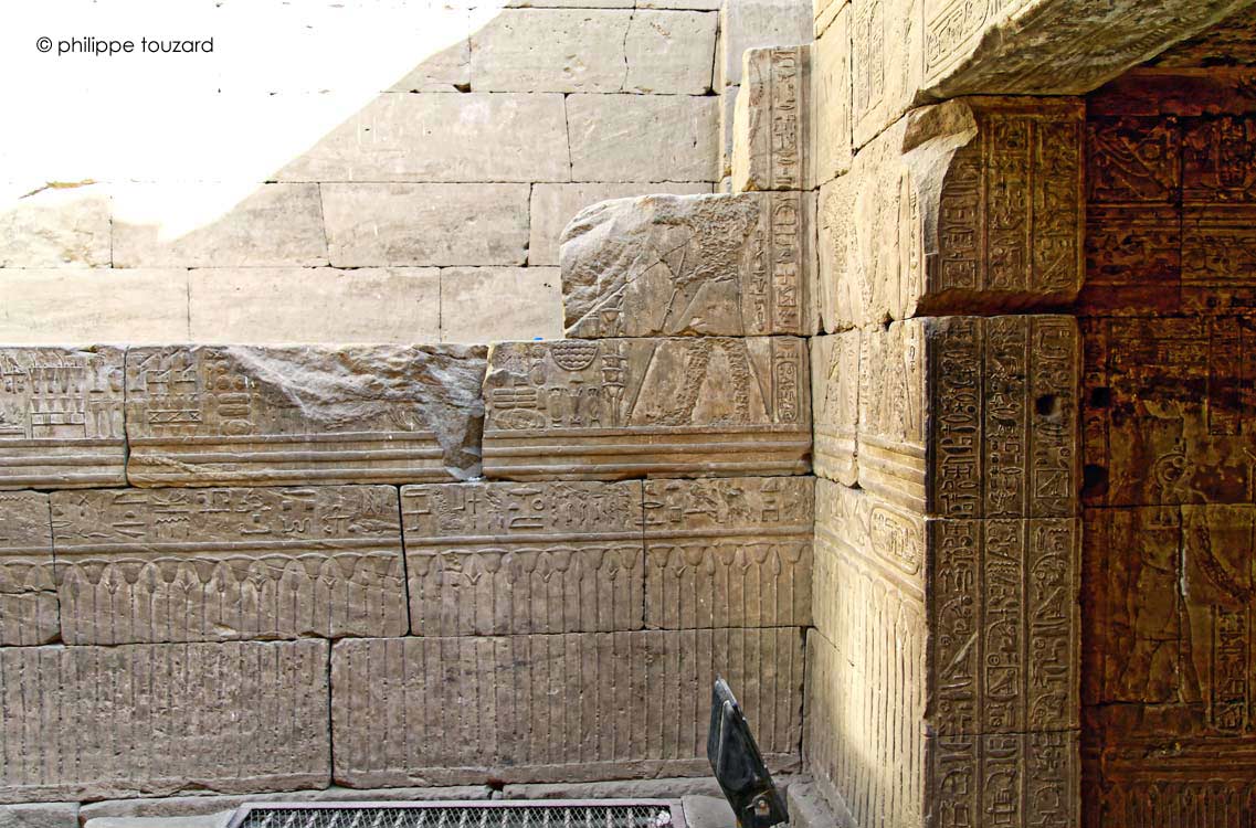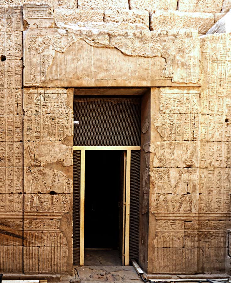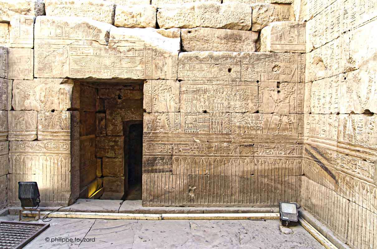 Sur les montants, le roi Ptolémée IV Philopator se tient devant Horus.