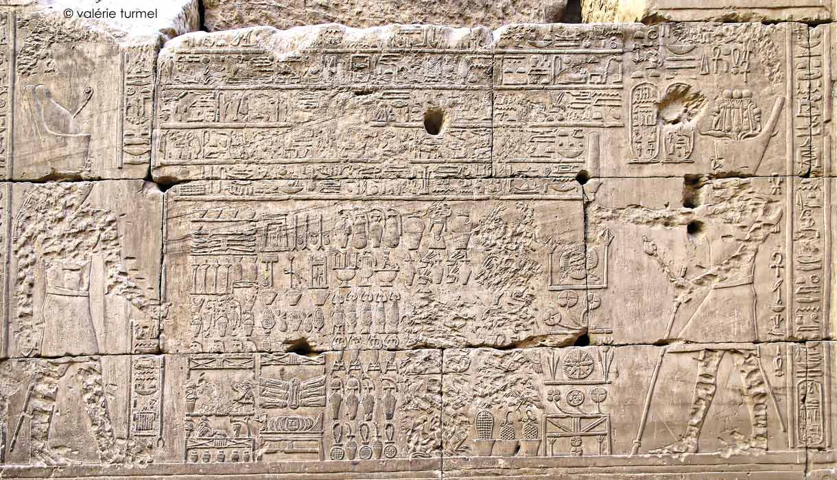 Le roi Ptolémée IV Philopator tend ses 2 sceptres vers la grande offrande qu'il offre à Horus de Behedet, le grand dieu maître du ciel. A gauche, des pots d'encens, des encensoirs, des tissus, des statuettes, un naos, une chapelle. Puis des pots, des victuailles, une tête de boeuf, des canards, des fruits et des fleurs.