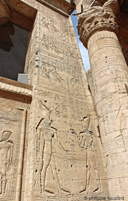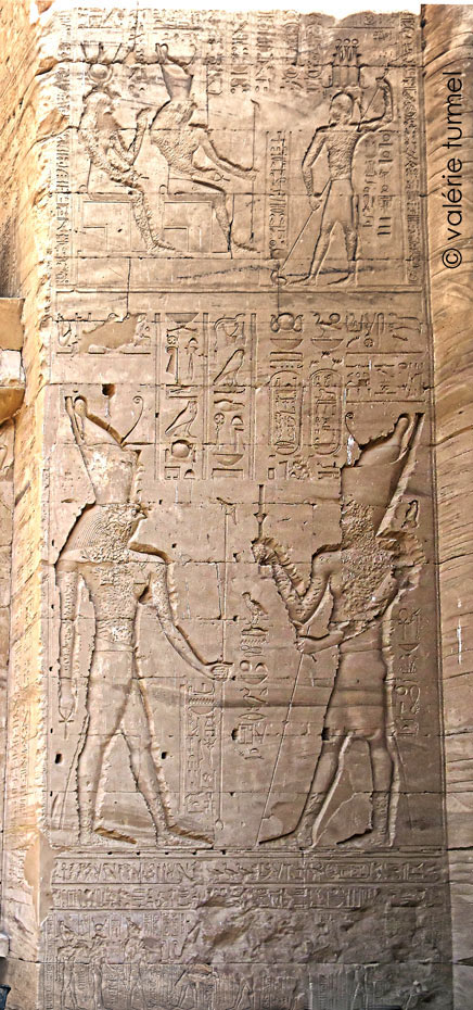 - en haut, le roi Ptolémée IX massacre un hippopotame, animal séthien, devant Horus et Isis.