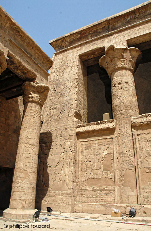 A gauche,la scène du bas du pilier montre le roi tendant un sceptre à Horus de Behedet, dieu vénérable, maître du ciel. Le dieu donne au roi toutes choses.