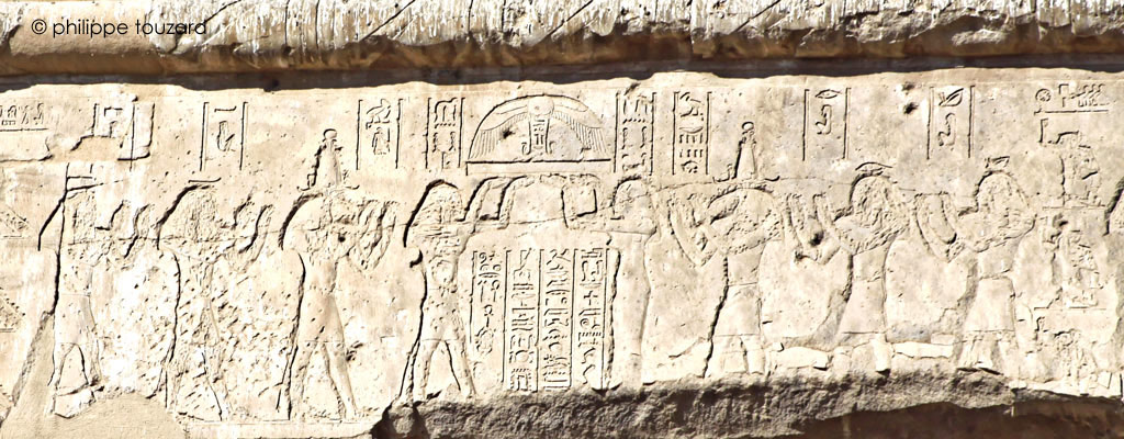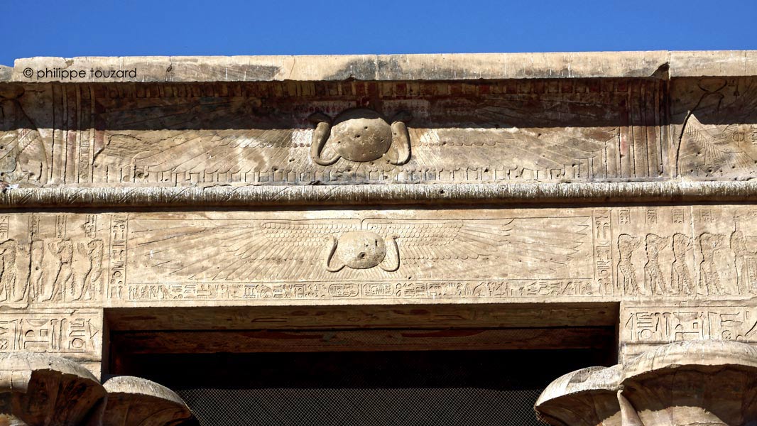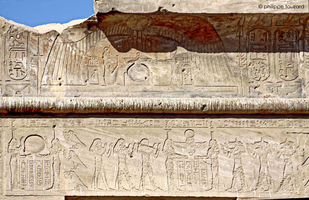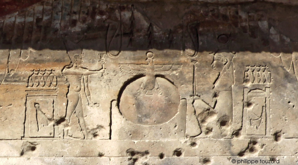 Détail de la scène sous le disque ailé de la frise : à gauche, le roi joue du sistre et à droite, Hathor.