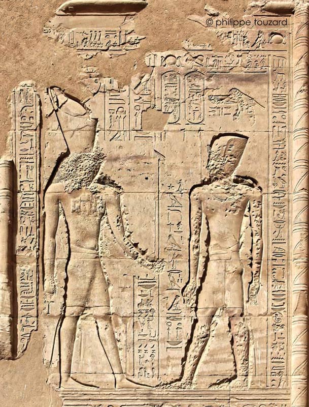En dessous, sur chaque colonne, Behedet et Nekhbet encadrent un cartouche du roi.