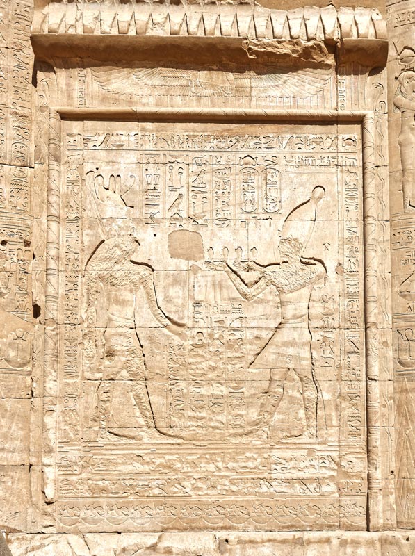 Sue le mur bahut, le roi Ptolémée VIII se tient devant Horus. Au dessus de lui, Behedet veille.
