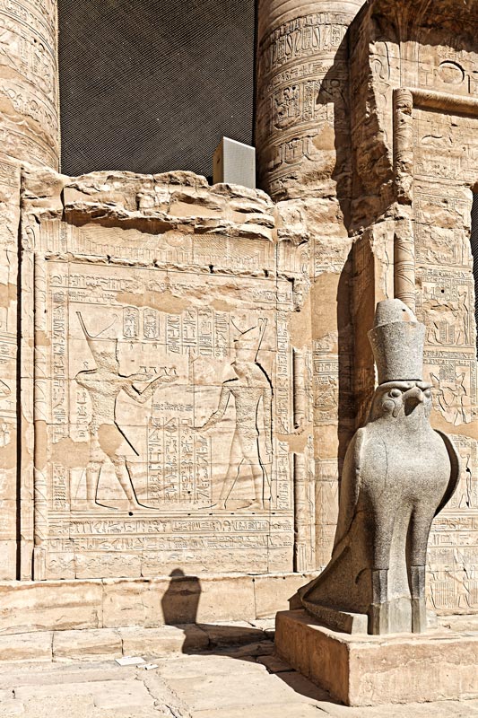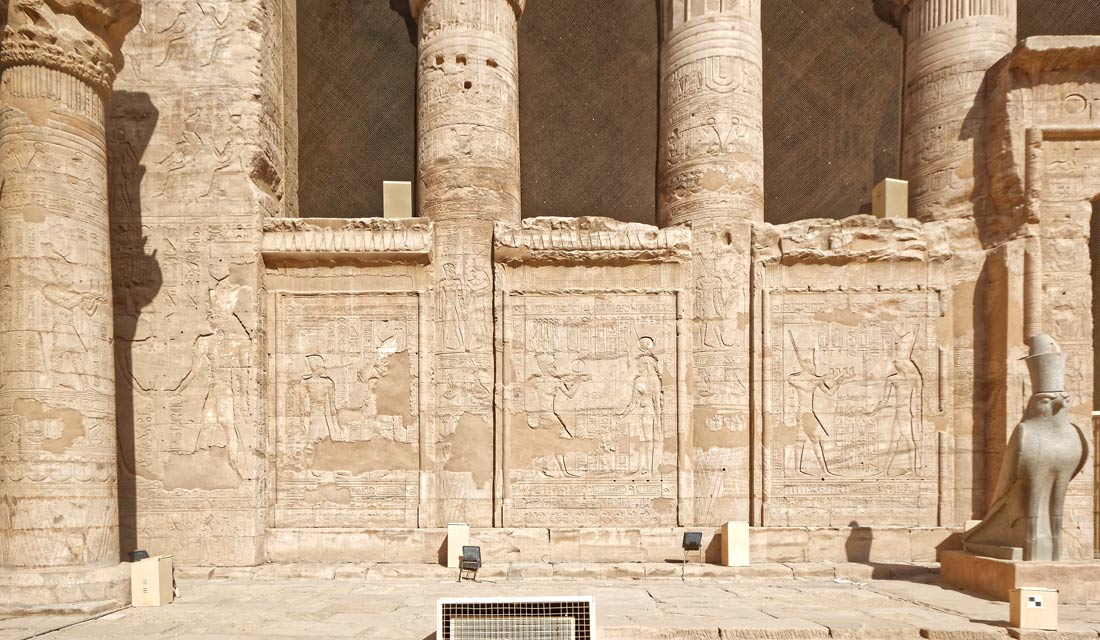 A gauche, le pilier ou ante Ouest et la dernière colonne Ouest de la cour. Les colonnes de la façade s'ornent de différents bandeaux avec des frises et des textes. Les scènes des mur-bahut sont discutées ci-dessous : la scène avec Hathor, au milieu, est encadrée par deux scènes avec Horus.