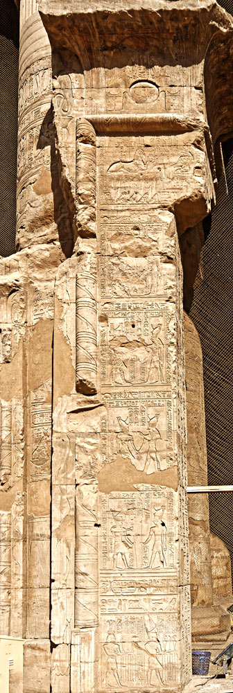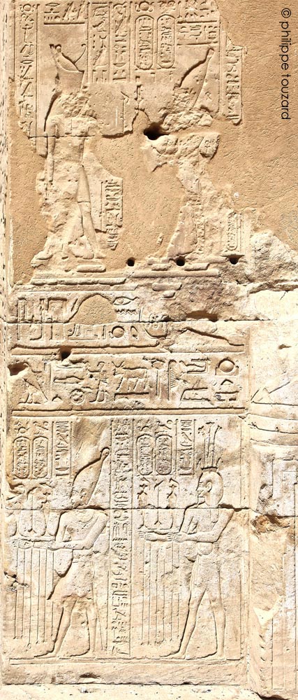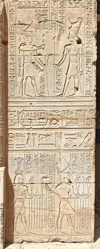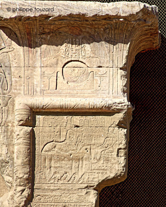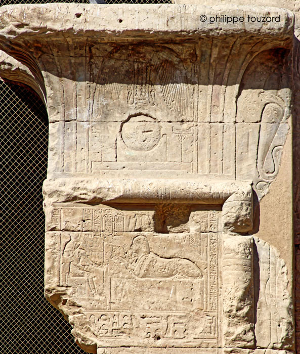 En dessous, sur la pseudo-architrave, le roi Ptolémée VIII Evergéte est représenté en sphinx devant Horus.
