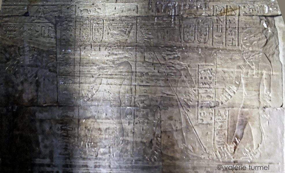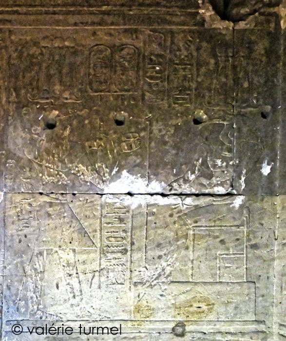 La niche dans le mur contenait un coffre dans lequel étaient rangés différents papyrus. Les 6 lignes de textes donnent une partie de la liste des papyrus : formules pour conjurer les forces du mal, recettes du laboratoire, un inventaire des offrandes et des dieux, un ouvrage d'astronomie, un manuel de décoration et des livres de liturgie. (S. Cauville, Edfou, p.18). La paroi d'en face comporte elle aussi une niche et 7 lignes de texte qui complètent celles-ci.