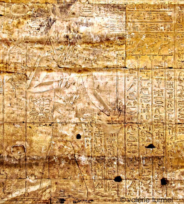 - A gauche, en haut, le roi Ptolémée VIII Evergetes II avance précédé d'enseignes. En bas, il est derriere Iounmoutef.