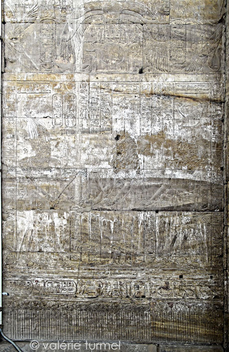 - A droite, il reçoit la vie en haut de Montou et en bas d'Harsomtous, dieu-fils de la triade de Dendara.