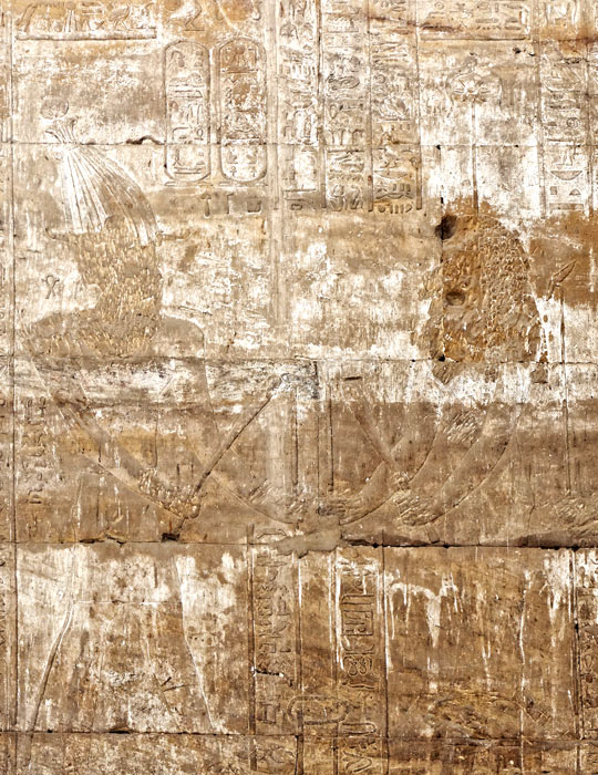 En haut, se devinent le disque solaire ailé au dessus de l'horizon, Rê-Horakhty, et des cartouches enveloppés par les ailes d'Horus. En dessous, le roi et Sechat plantent des piquets en présence d'Horus.