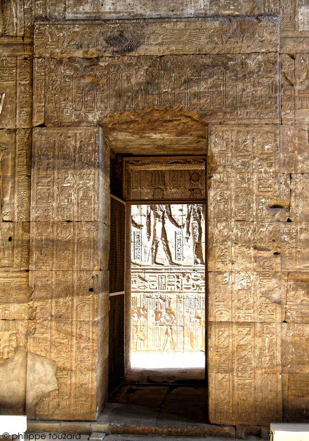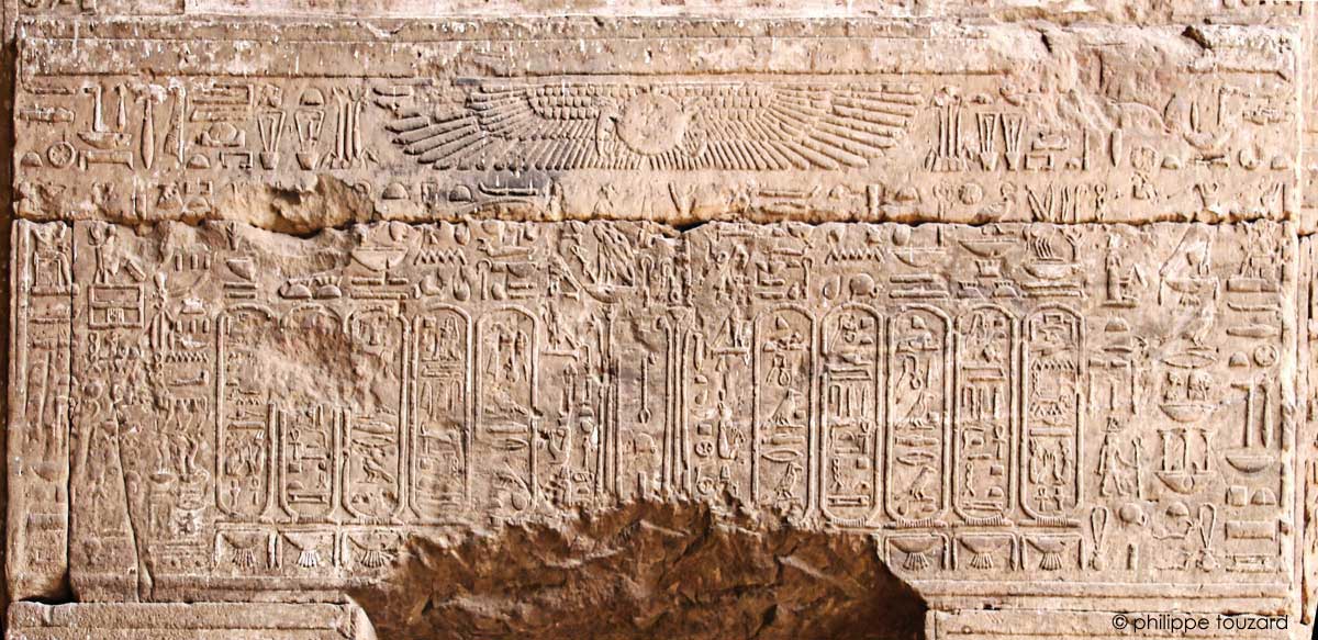 Le disque ailé Behedet veille en haut du linteau. Juste en dessous, au centre, Nekhbet au Nord et Ouadjet au sud. De chaque côté, 6 cartouches détaillent la titulature de Ptolémée VIII Evergète II.