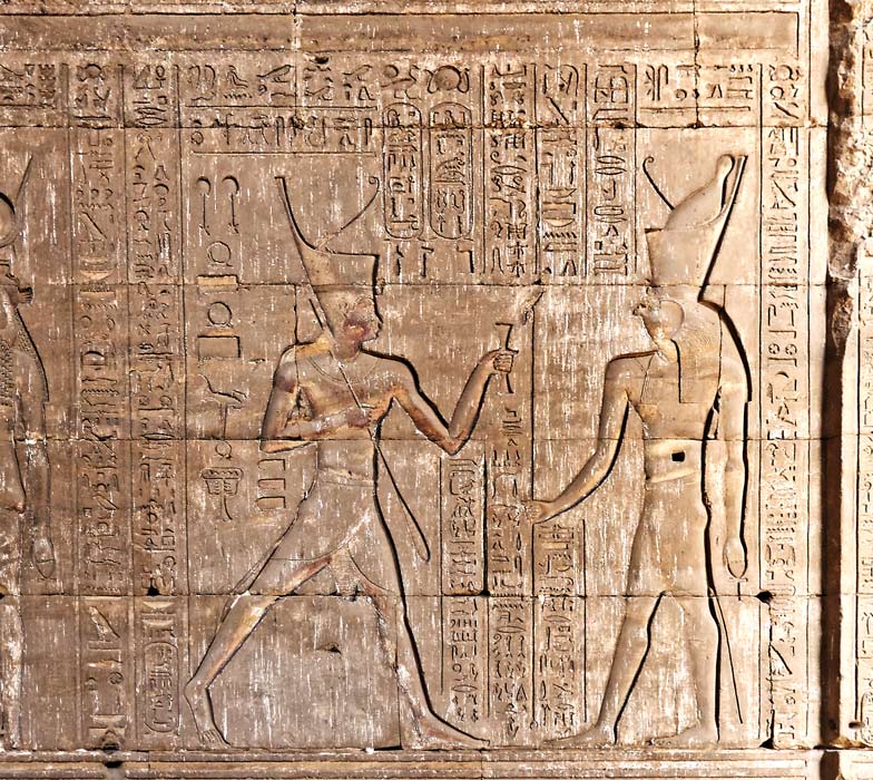 Le roi Ptolémée moule la premoère brique du temple devant Horus.