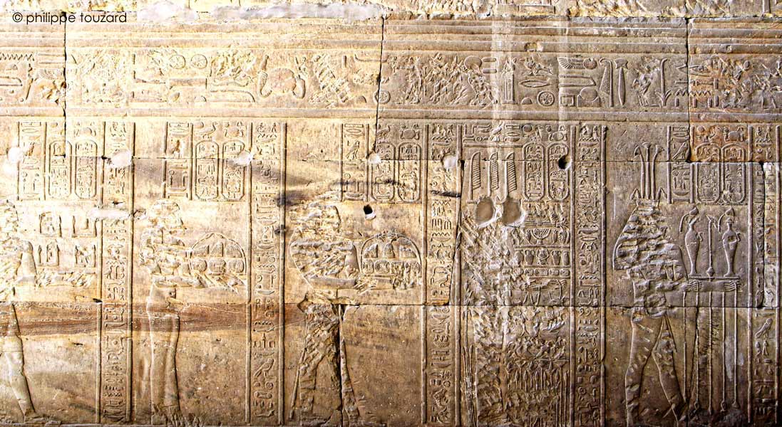 Le roi Ptolémée VIII Evergetes II accompgné par Cléopatre II (mains visible à gauche) coduit ledéfilé des dieux Nil porteyrs de présents vers Horus de behedet, le grand dieu,mître du ciel, suivi d'Hathor d'Iounet et d'Harsomtous, fils d'Horus et d'Hathor.
