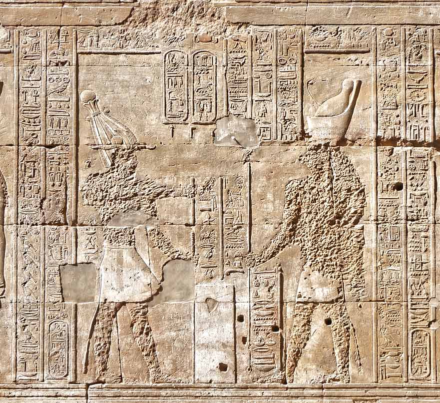 Scène représentant la construction du temple : le roi Ptolémée VIII est debout devant Horus de Behedet