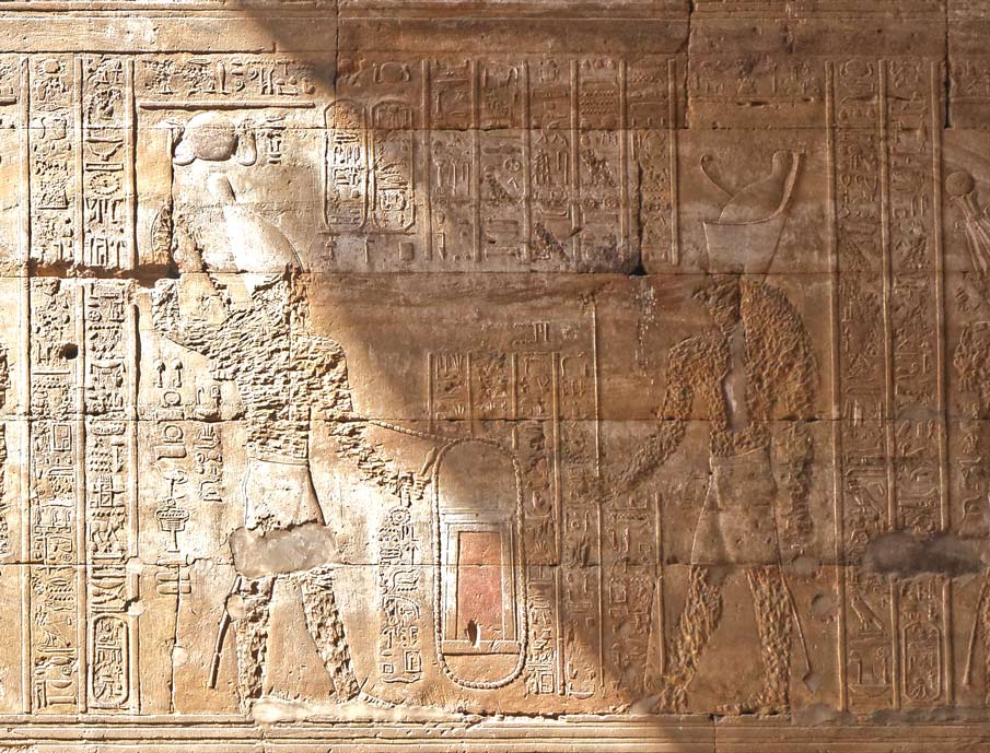 Le roi Ptolémée VIII Evergétes II creuse la tranchée pour délimiter le temple, atteindre l'eau primordiale et déterminer l'horizontale, en présence d'Horus et d'Hathor. Horus de Behedet, grand dieu, maître du ciel, lui donne toute la force. Hathor est la dame de Iounet, oeil de Rê, qui réside à Behedet.