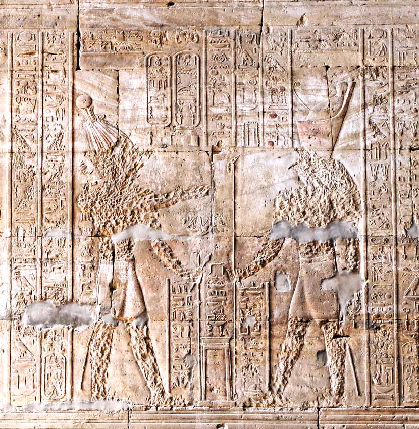 Le roi Ptolémée VIII lance du natron pour purifier le temple. Derrière le roi, la formule de protection.