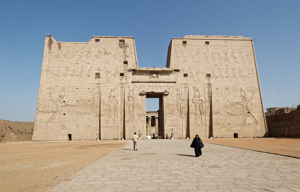 Les fondations du pylône étaient déjà creusées à la mort de Ptolémée VIII Evergéte II. Sa décoration ne fut entreprise et terminée que sous Ptolémée XII Neos Dionysos. Son épouse Cléopatre VII Tryphaina (la fameuse Cléopatre) le destitua en ~58 et c'est sous son règne que les portes massives en cèdre du Liban furent mises en place le 5 décembre ~57.