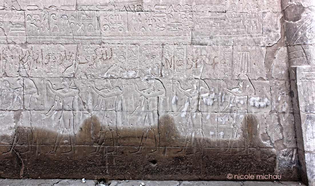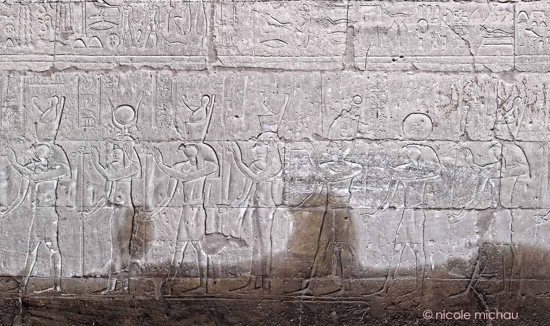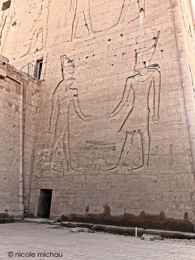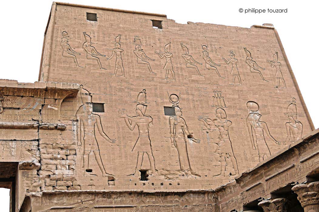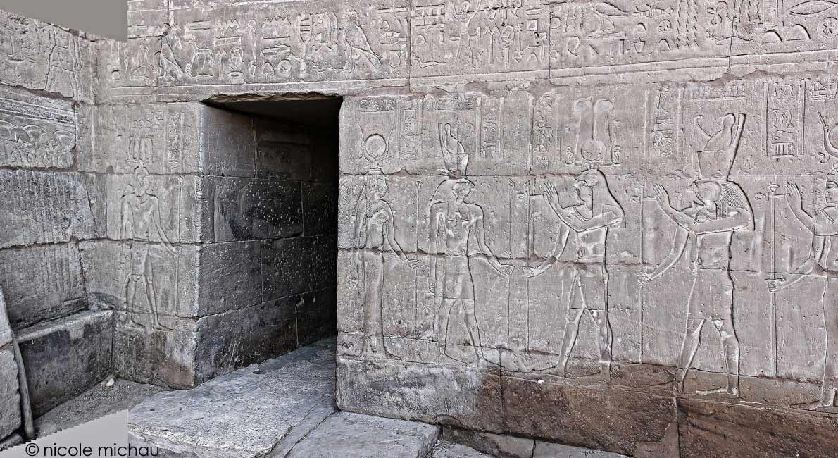 Le roi Ptolémée Neos Dionysos tend le signe de vie à Horus en tête du défilé des dieux qui s'avancent vers le Triade d'Edfou : Horus, Hathor et, de l'autre côté de la porte, Harsomtous. Derrière le roi, un autre Horus.
