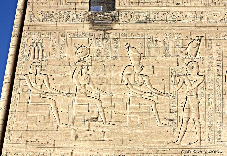 le roi Ptolémée Neos Dionysos offre les 2 yeux Oudjat à Osiris, Isis, Nephtys, Horus et les fils d'Horus