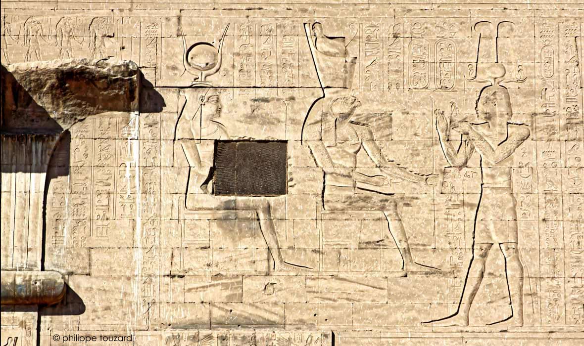 Le roi Ptolémée XII Neos Dyonisos offre un uraeus à Horus et Hathor.