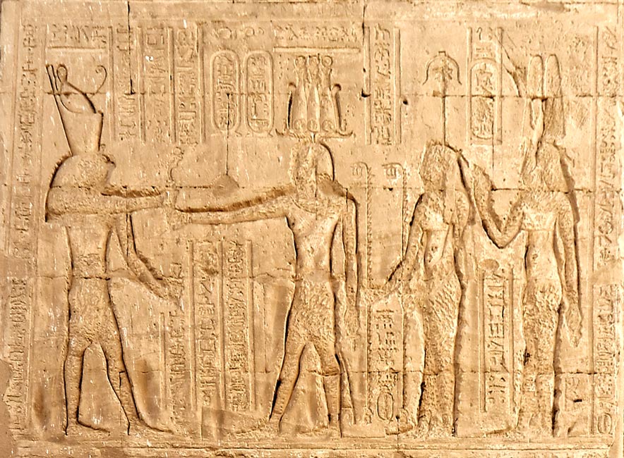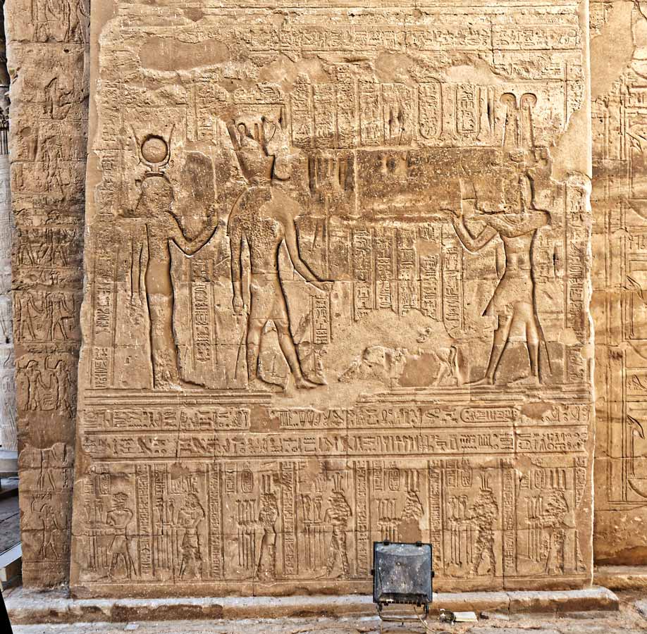 Le roi Ptolémée Neos Dionysos fait une offrande à Horus et Hathor. En dessous, une partie du défilé des dieux Nil. Sur le côté, des dieux ont été représentés sur la tranche du décrochement du mur du passage : ils protègent l'entrée du temple.