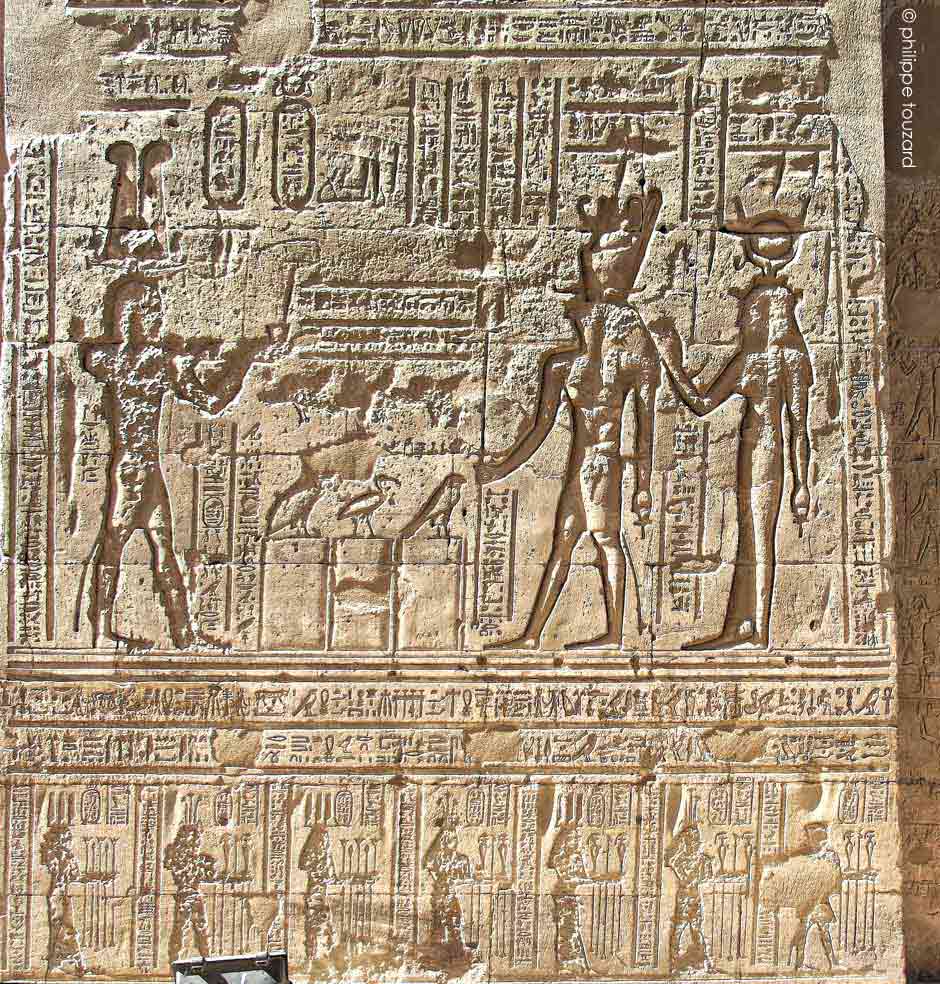 Le roi Ptolémée Neos Dionysos offre 3 oiseaux, un faucon, un ibis et un vautour,