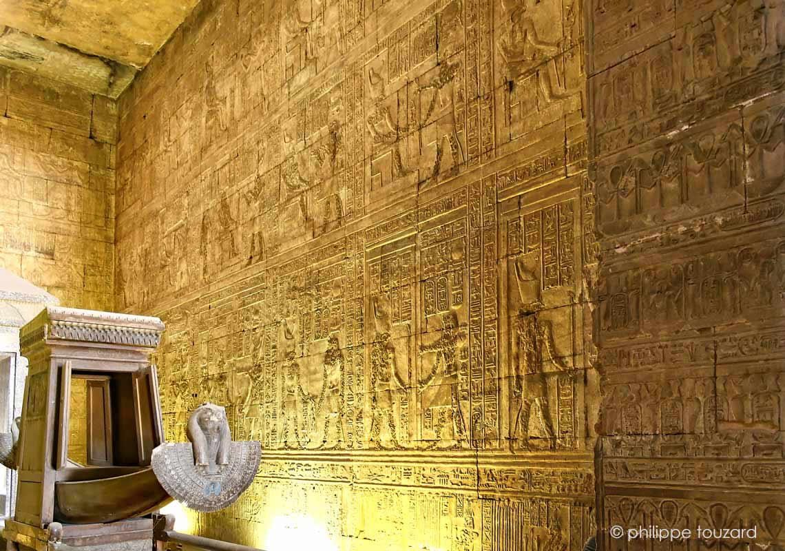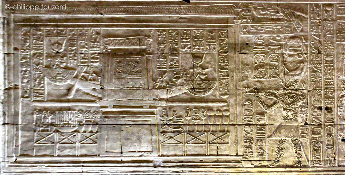 Les emblèmes de la déesse sont également représentés sous la barque : clepsydre, collier-menat, sistres et miroirs.