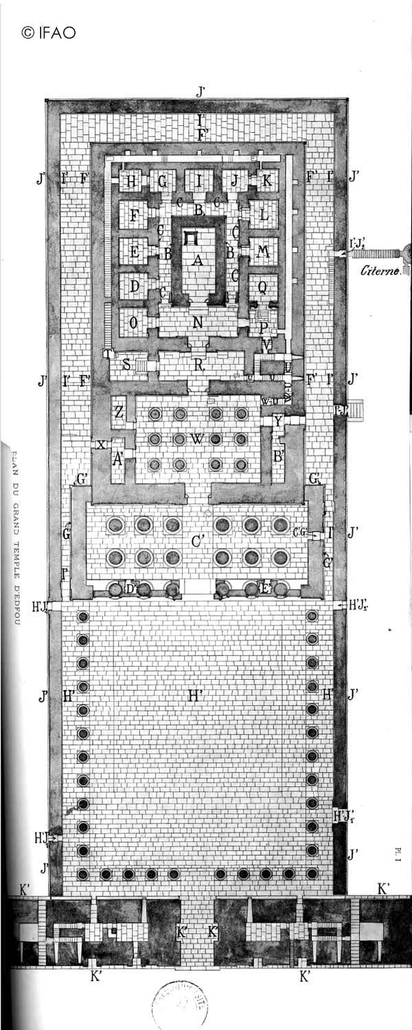 Ce plan a été publié par Chassinat, planche I du Tome 1 avec un marquage par lettres. L'axe du temple est pratiquement orienté Nord-Sud. (directions rajoutées au plan initial)
