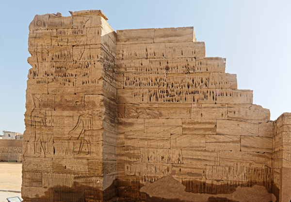 Cette scène est située dans le passage de la porte Sud, côté Ouest. Le roi Ptolémée XII offre des fleurs à Horus qui tient le signe de vie.