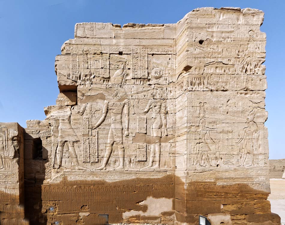 Le roi avec la couronne blanche fait une offrande à un dieu (détruit). En dessous, au milieu des représentations florales, Behedet et Nekhbet encadrent les deux cartouches du roi.