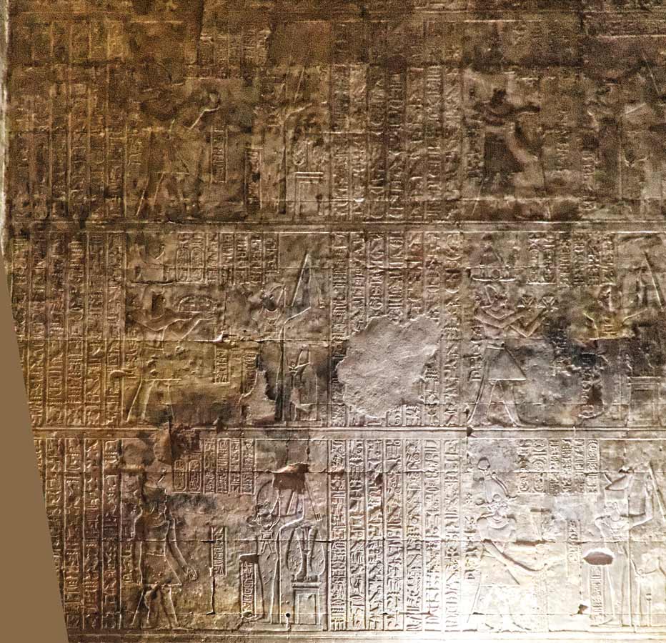 Le roi Ptolémée IV Philopâtor est en adoration devant le dieu Min dans Behedet, représenté ithypkallique comme d'habitude; le bras levé pour repousser les ennemis.