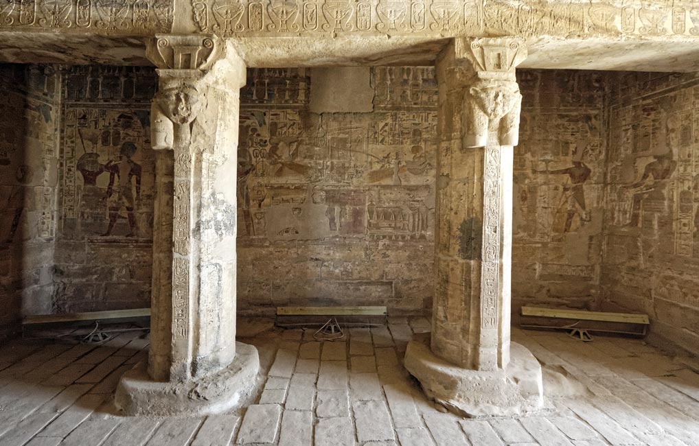 Le sanctuaire est une grande pièce assez bien décorée. eux piliers hathoriques soutiennent les architraves. Les parois latérales montrent notamment des scènes où le roi bénit les grandes barques royales.
