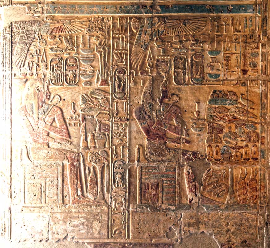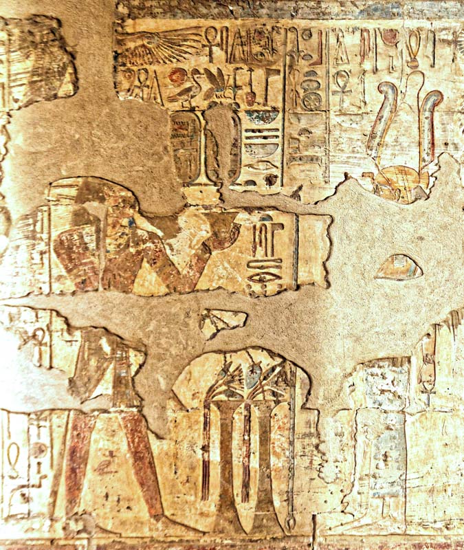 Scène à gauche en entrant à côté de la porte : à gauche, Thoutmosis IV <Men-Kheperou-Rê> et à droite son fils Amenophis (Amenhotep) III <Neb-Mât-Rê> sont représentés devant des tables d'offrandes. Au dessus, la déesse Nekhbet à gauche et la déesse Ouadjet à droite. La déesse Oudjet donne la santé, la vie, la stabilité et la puissance. Cette scène est symétrique de celle de droite.